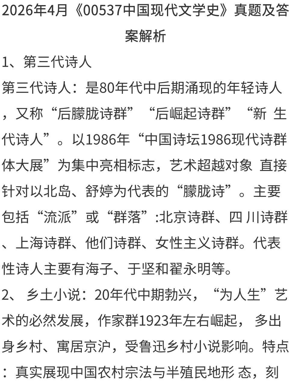 2026年4月《中国现代文学史》20个3星【大题】考点【拿分必背】