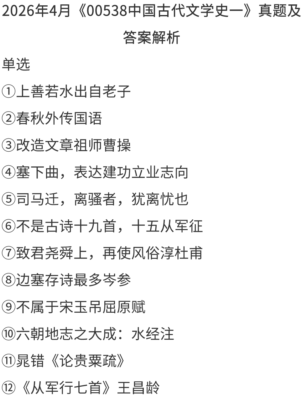 2023年10月《中国古代文学史(一)》真题答案出炉!