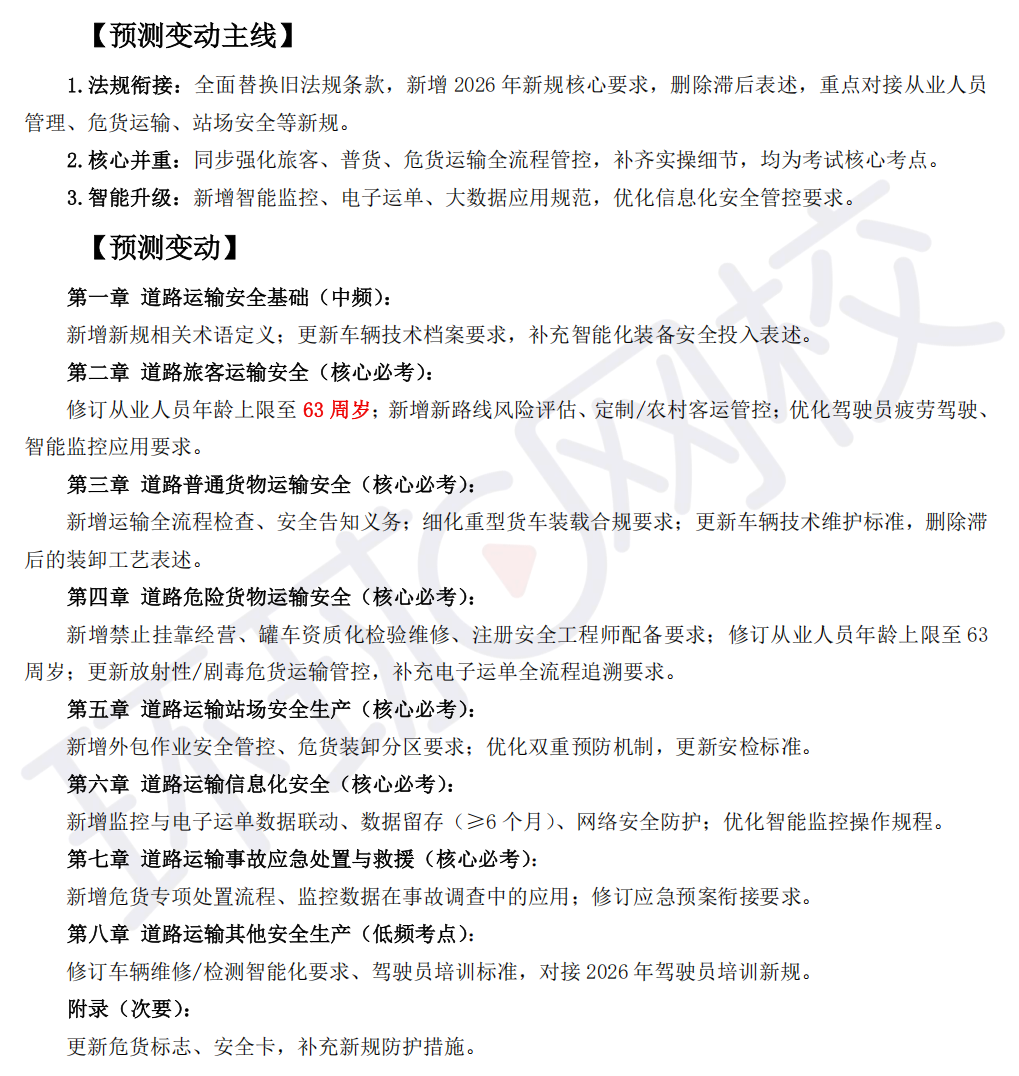 2026中级注安《道路运输》教材变动预测