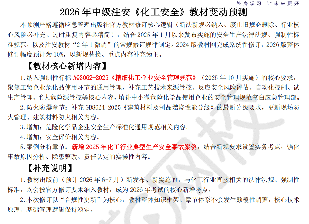 2026年中级注安《化工安全》教材变动预测