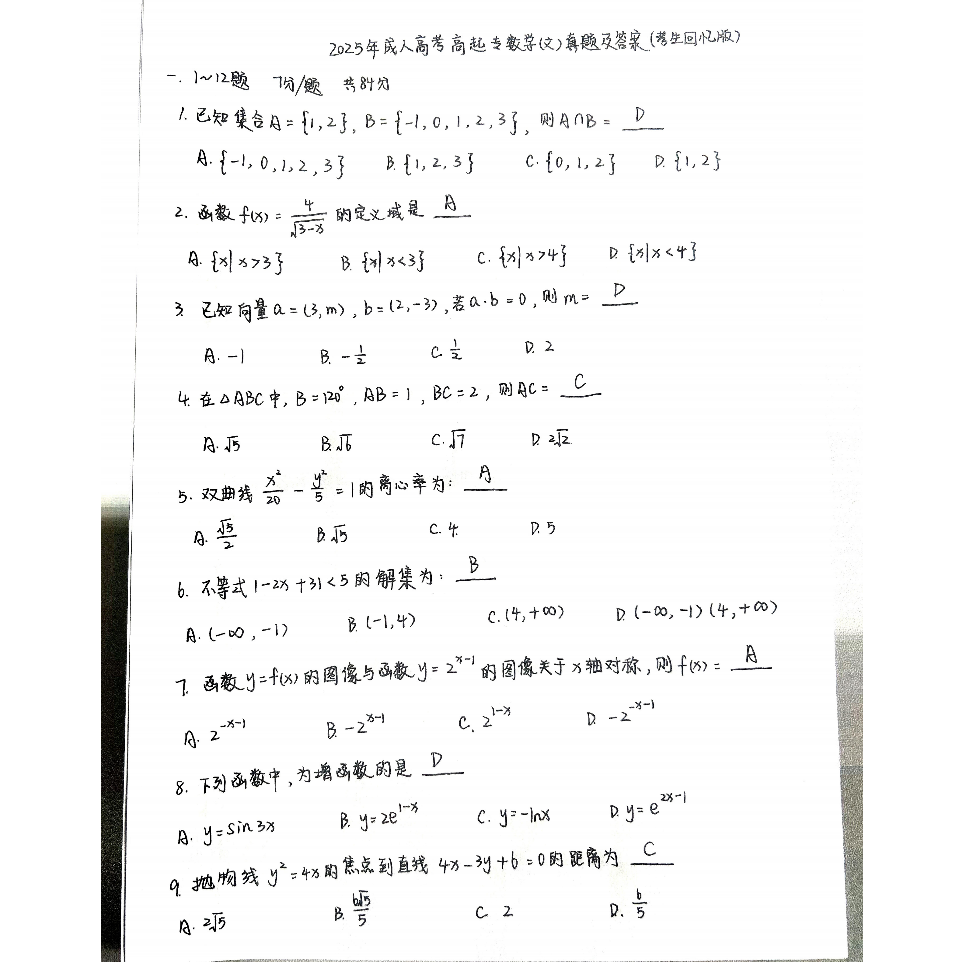 2025成人高考《文科数学》真题及答案(持续更新)