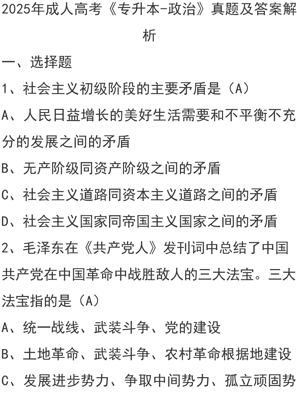 2025成人高考《专升本-政治》真题及答案(持续更新)