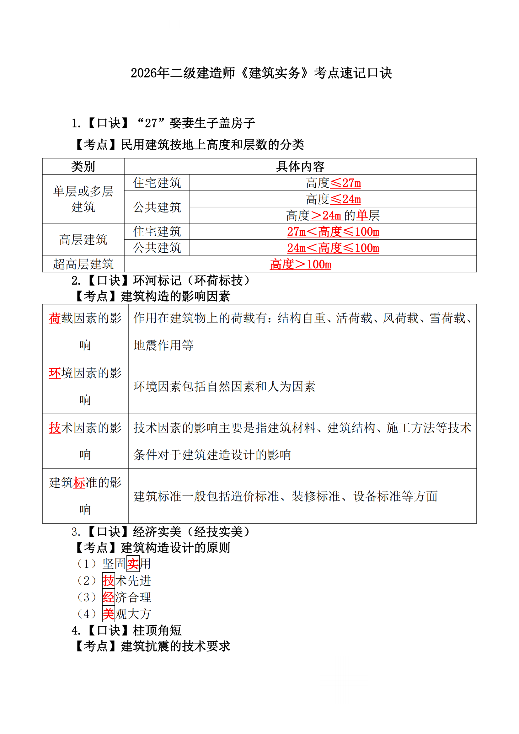 2026二建《建筑》34条考点速记口诀