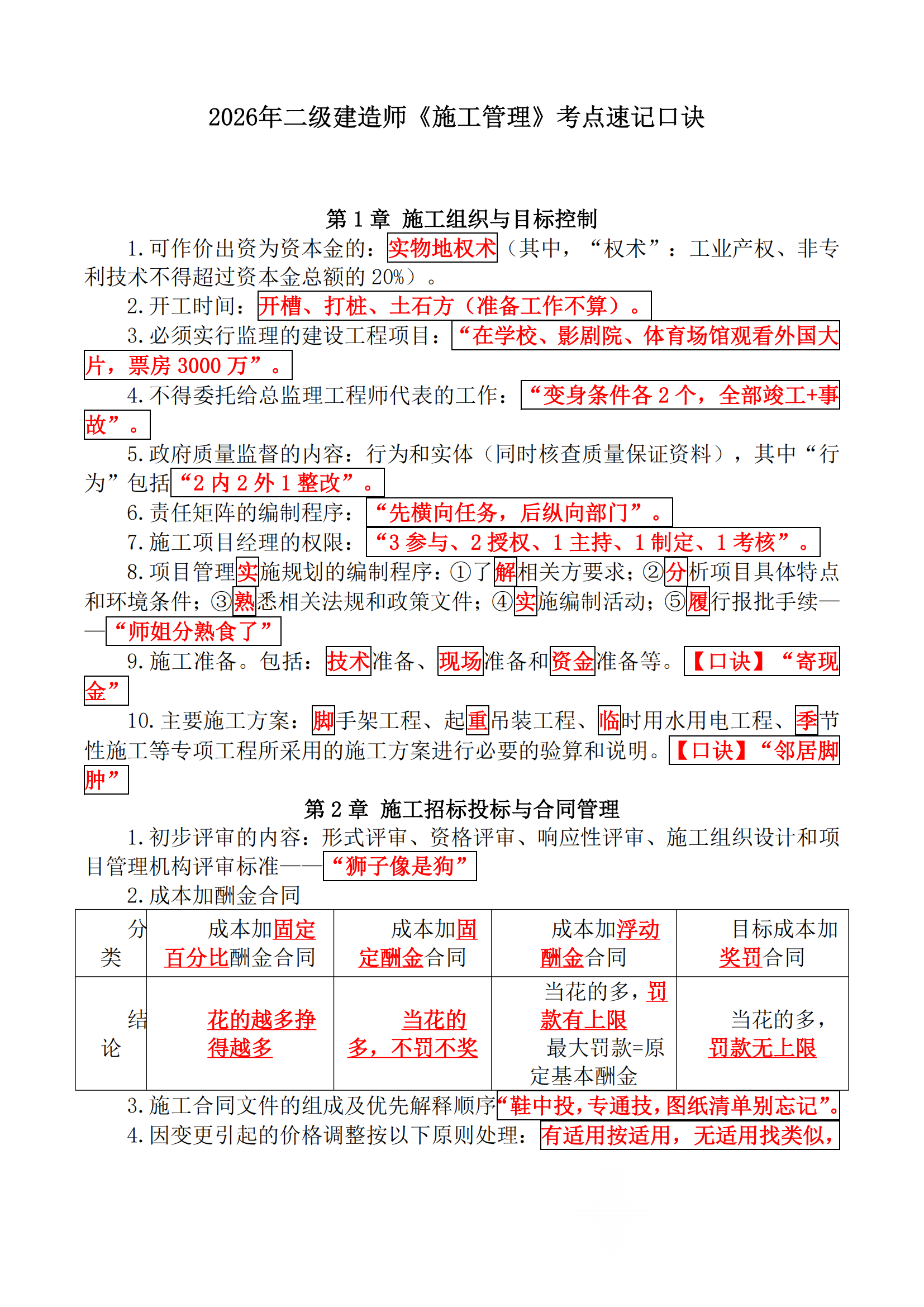 2026二建《施工管理》37条考点速记口诀
