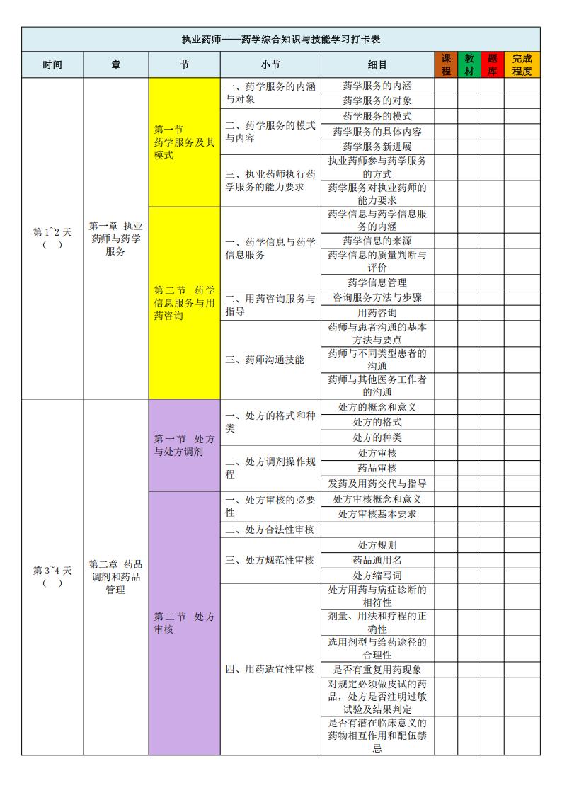 执业药师【药学综合】学习打卡表