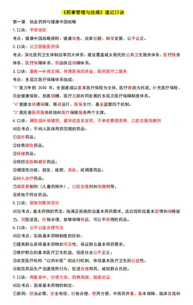 执业药师《药事管理与法规》速记口诀