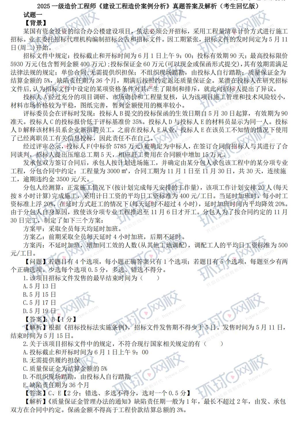 2025年一级造价师《案例分析》真题及答案