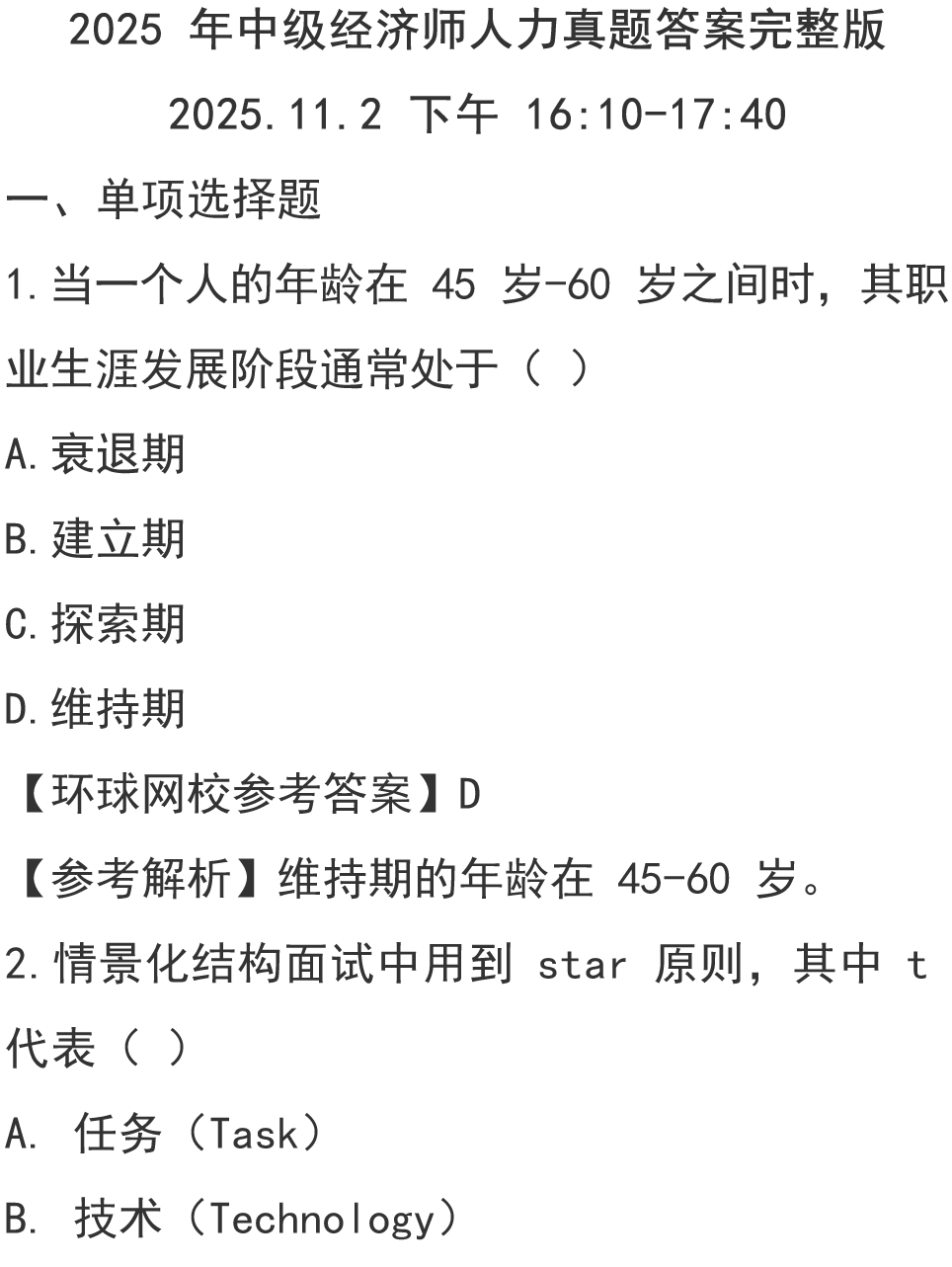 完整版2025中经《人力资源》真题答案11月2日下午